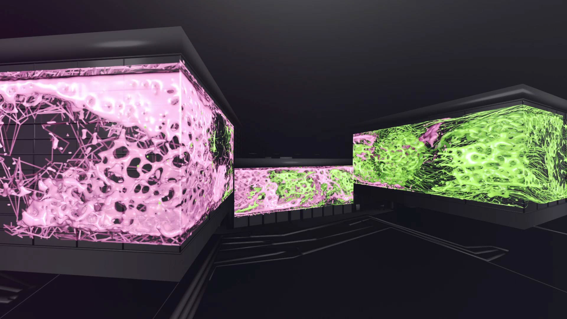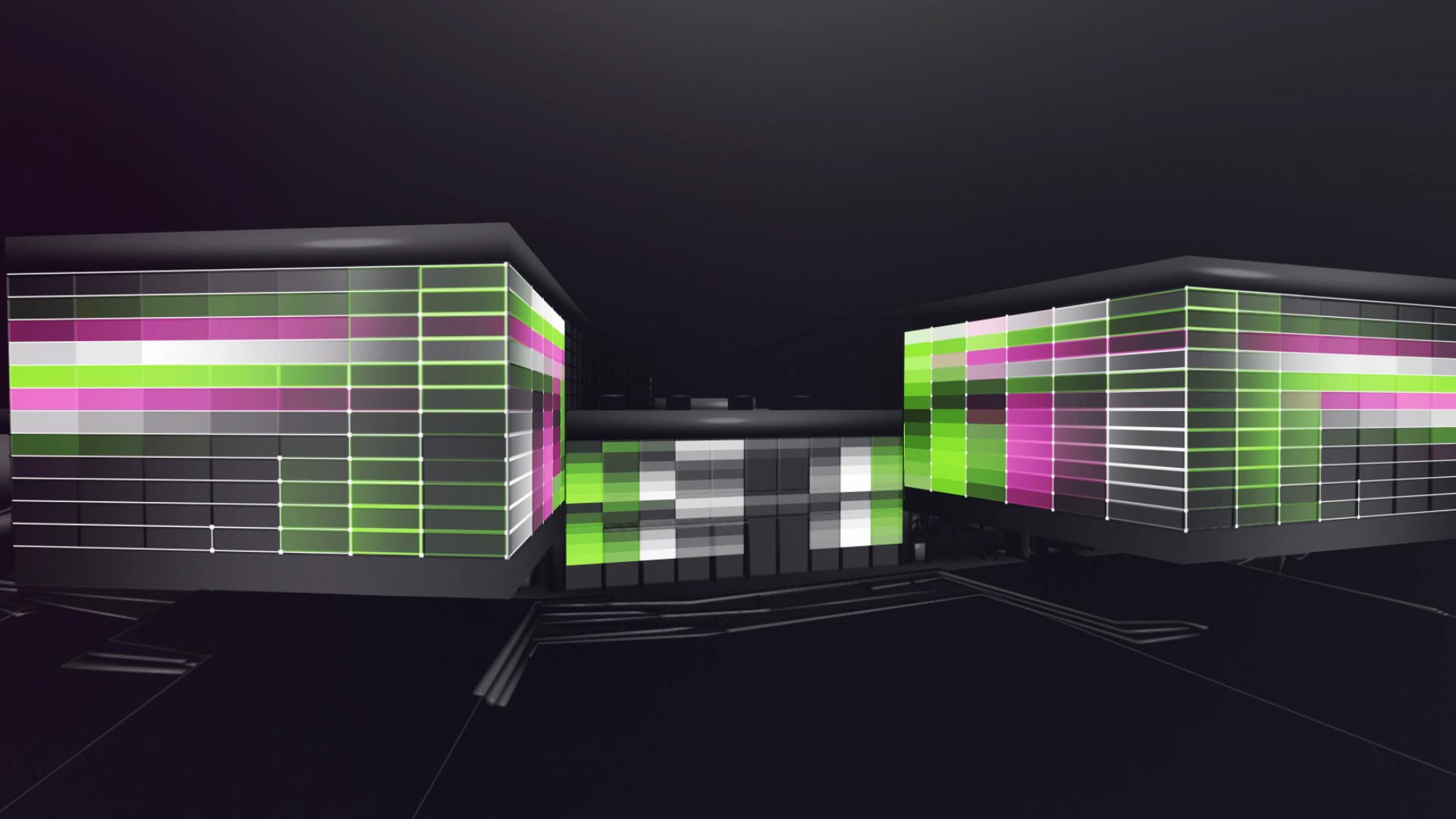 Projection mapping for Brainville Culture Park. In this animation the goal was to show the synergy between technology and nature, as Brainville is located in a remote mountainous area. It was also crucial to show the innovative architecture of the new building. This project was marked by a very short turnaround time and technical challenges as the final timeline was 8000x1200 and had to be output for five projectors. Finding optimal render and animation solutions was key to the success of this project. Project completed with Onlight studios.